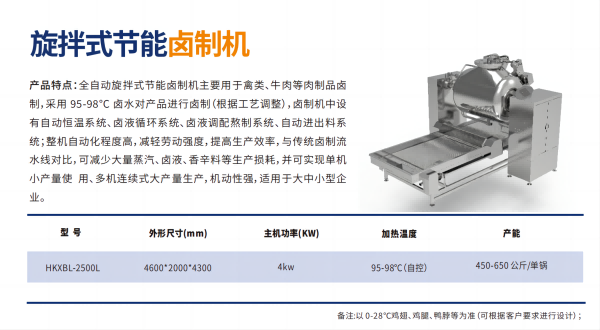 全?動(dòng)旋拌式節(jié)能?制機(jī)主要?于禽類、??等?制品?制,采? 95-98 °C ??對(duì)產(chǎn)品進(jìn)??制(根據(jù)?藝調(diào)整),?制機(jī)中設(shè)有?動(dòng)恒溫系統(tǒng)、?液循環(huán)系統(tǒng)、?液調(diào)配熬制系統(tǒng)、?動(dòng)進(jìn)出料系統(tǒng);整機(jī)?動(dòng)化程度?,減輕勞動(dòng)強(qiáng)度,提??產(chǎn)效率,與傳統(tǒng)?制流?線對(duì)?,可減少?量蒸汽、?液、??料等?產(chǎn)損耗,并可實(shí)現(xiàn)單機(jī)?產(chǎn)量使 ?、多機(jī)連續(xù)式?產(chǎn)量?產(chǎn),機(jī)動(dòng)性強(qiáng),適?于?中?型企業(yè)。